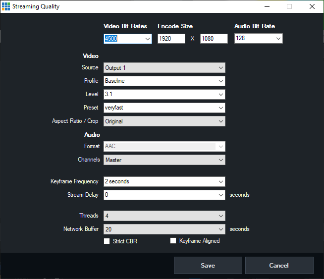 The Streaming Quality window allows you to customise your streaming quality settings to suit your production.
