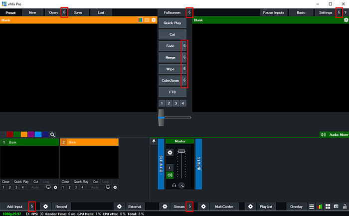 vMix buttons may have numbers 5 and 6 instead of a triangle arrow icon