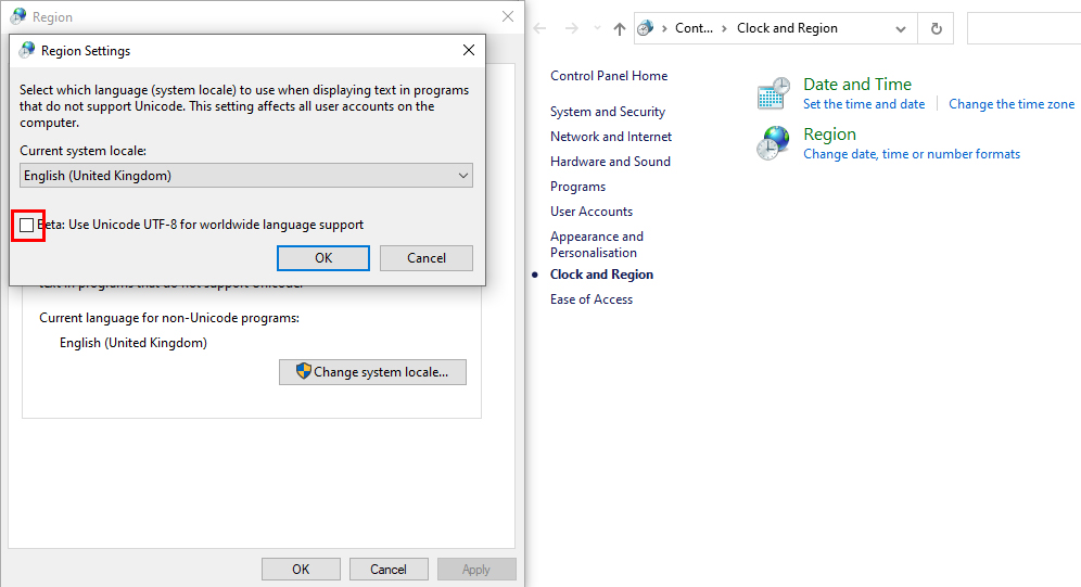 8.     Make sure the checkbox for Beta: Use Unicode UTF-8 for worldwide language support is not ticked and press OK