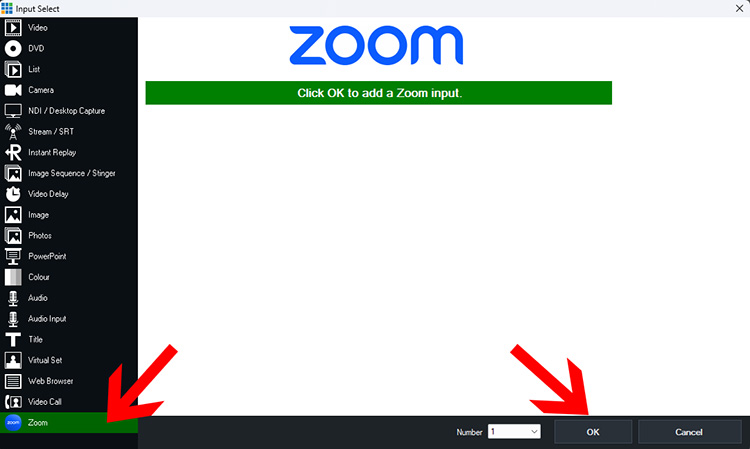 After installing, re-open the Add Input menu, select the Zoom tab, then click OK to add a new Zoom input.