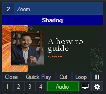 Participant Source Type: Choose from Video, Share or Auto. Video will show the Zoom participant's camera. Share will show the Zoom participant's Screen Share if they are doing one. Auto will automatically switch if they are sharing and when not sharing switch back to their camera. These options are useful in that you can have two separate Zoom inputs with one assigned to their camera and one assigned to their screen share if you would like to do a Layer or Picture in Picture layout etc. When the participant is sharing, a blue sharing banner will appear over the top of input, even if you have chosen Video as the source type.
